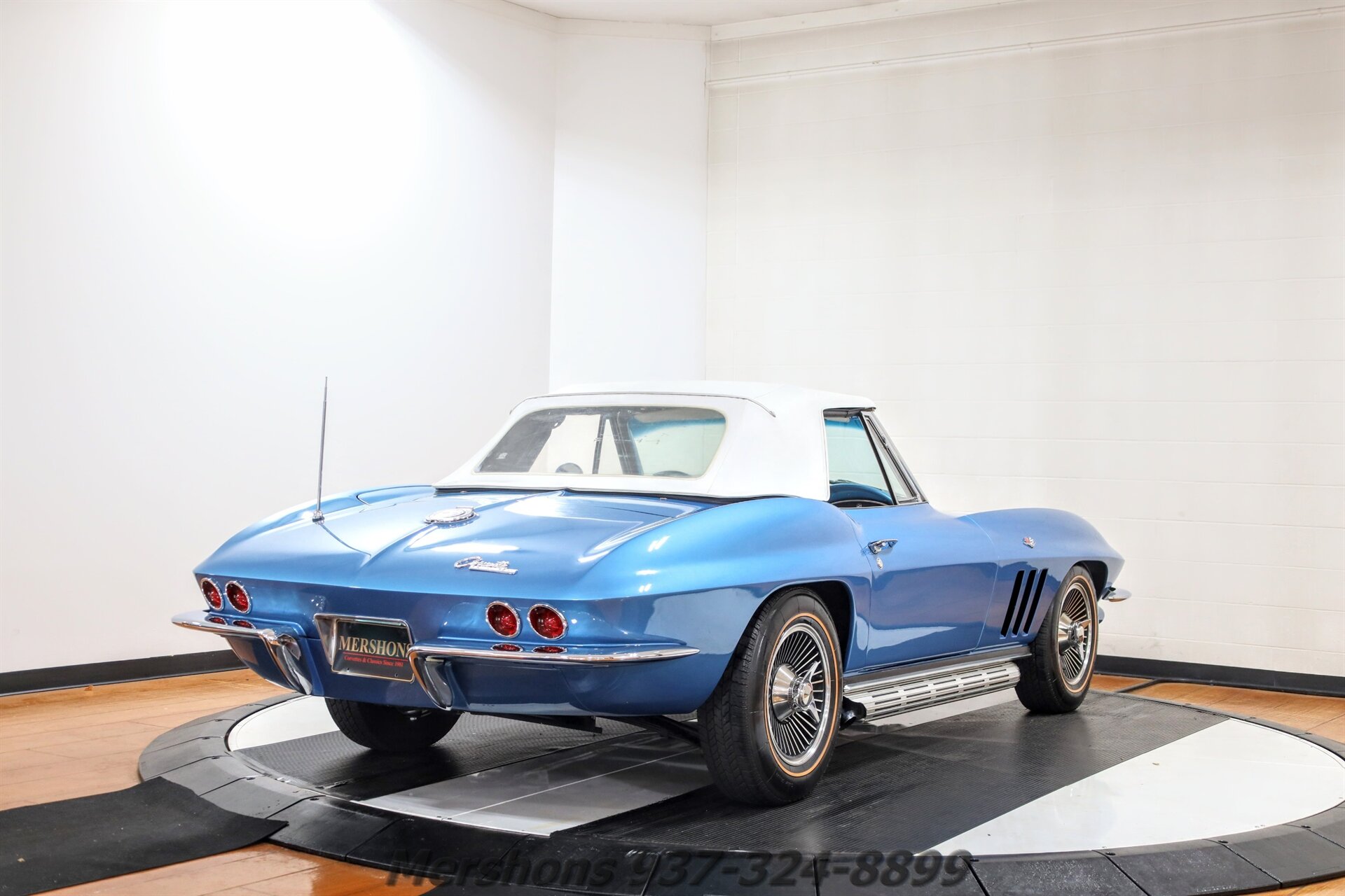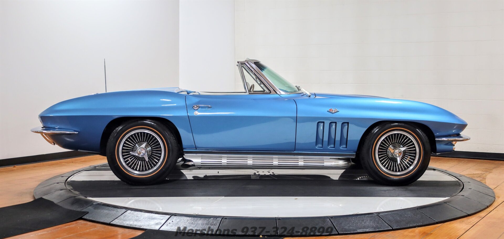 Color Code F-F Nassau Blue over Trim Code 450 White and Blue Two Tone Interior with a White Convertible Top. Casting Number '3782870' HT Suffix Block. Numbers Matching 327 350 HP Paired to a 4 Speed Manual Transmission. Many Factory Correct type components including ignition shielding, L79 Chrome air cleaner, Harrison radiator and expansion tank, dash pads, door panels and more. Features Include Side Exhaust, 'Vintage Air' Air Conditioning, Power Steering, Power Brakes, Knock off wheels wrapped in Goldline Radials and much more! This is a hard one to find! Power Steering and Power Brakes, with Side Exhaust on an L79?? Thats a mouthful! Plus Modern Ice Cold Air Conditioning!! There is a lot to like! Gorgeous Cosmetics, beautiful Stainless and Chrome! Clean and Dry Underbody that will impress! Nassau Blue is one of the BEST colors for a Mid-Year, its Always popular! So please give us a call today, and lets get this Immaculate Corvette parked in your garage today!