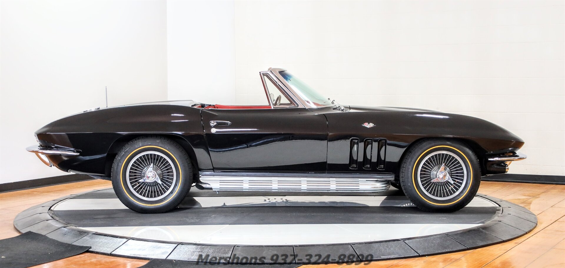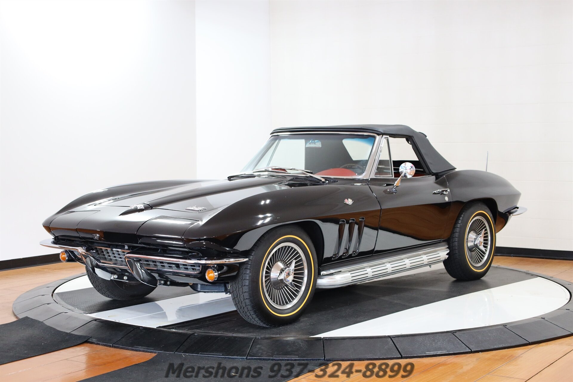 Color Code 900 Tuxedo Black Over Trim Code 408 Red Leather Interior with a Black Convertible top. Casting Number '3858174' HT Suffix Block. Numbers Matching 327 350 HP Paired to a 4 Speed Manual Transmission. Many Factory Type Components including Side Exhaust, ignition shielding, air cleaner, gas door assembly, door panels, bowtie mirror, Dash pads, Reverse Lamps, Knock Off Wheels with Goldline Radials and much more! One of the most Desirable Color Combinations on the Planet! Tuxedo Black over Red Leather Looks FANTASTIC! And if that wasnt enough, its an L79 with Side Exhaust! There is a lot to like about this Mid-Year! Excellent Cosmetics! Beautiful Stainless and Chrome! Nice Straight body with good gaps! Clean and Dry Undercarriage! This Corvette will NOT LAST LONG! So please give us a call today for more information, we would love to hear from you!