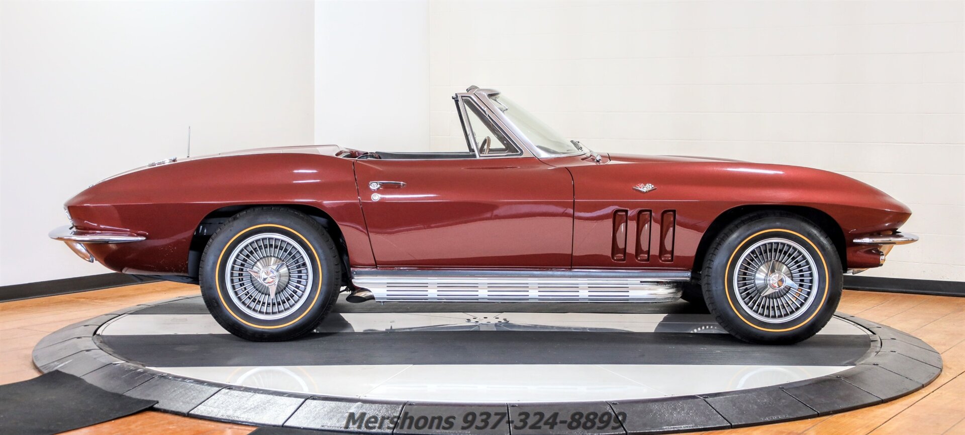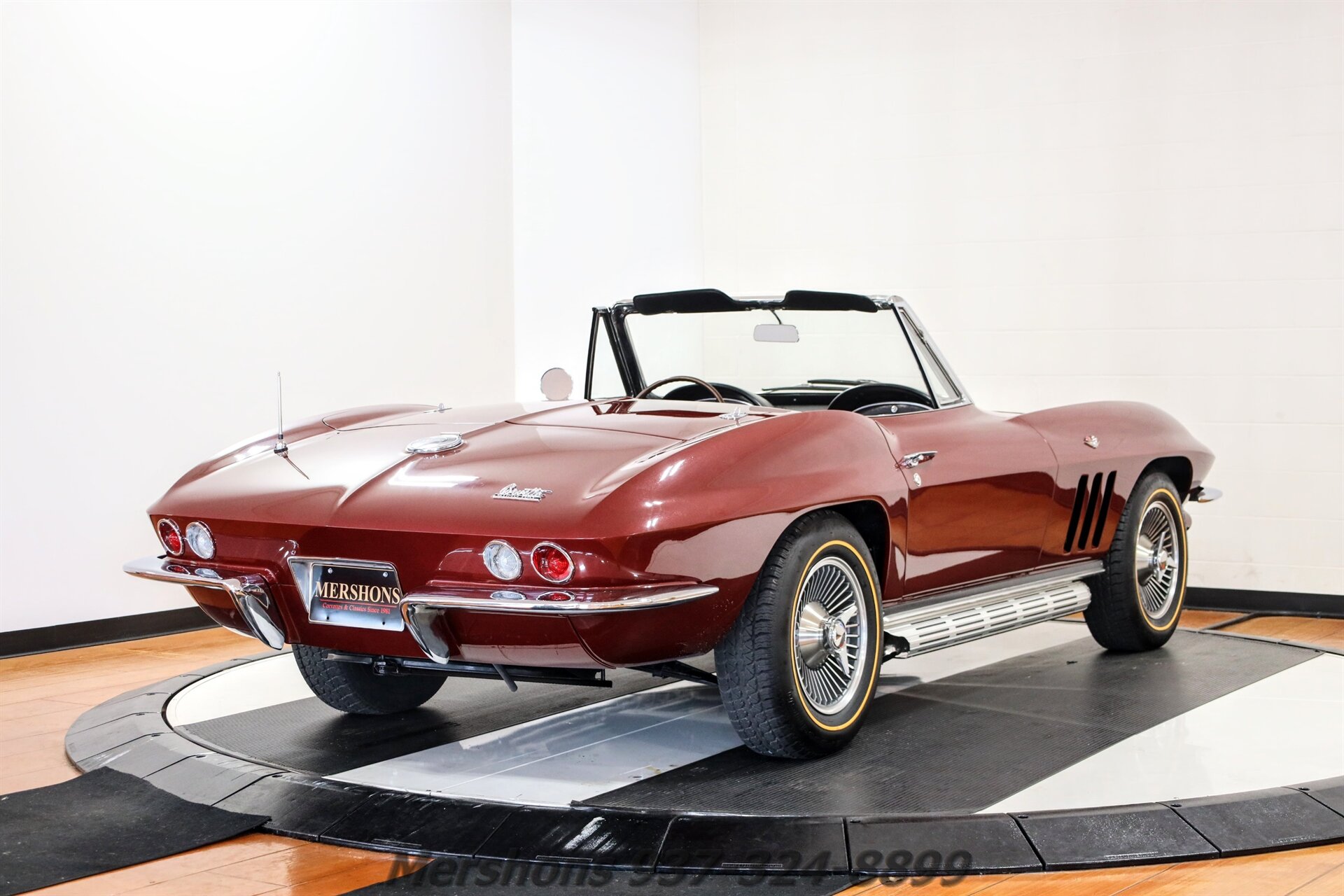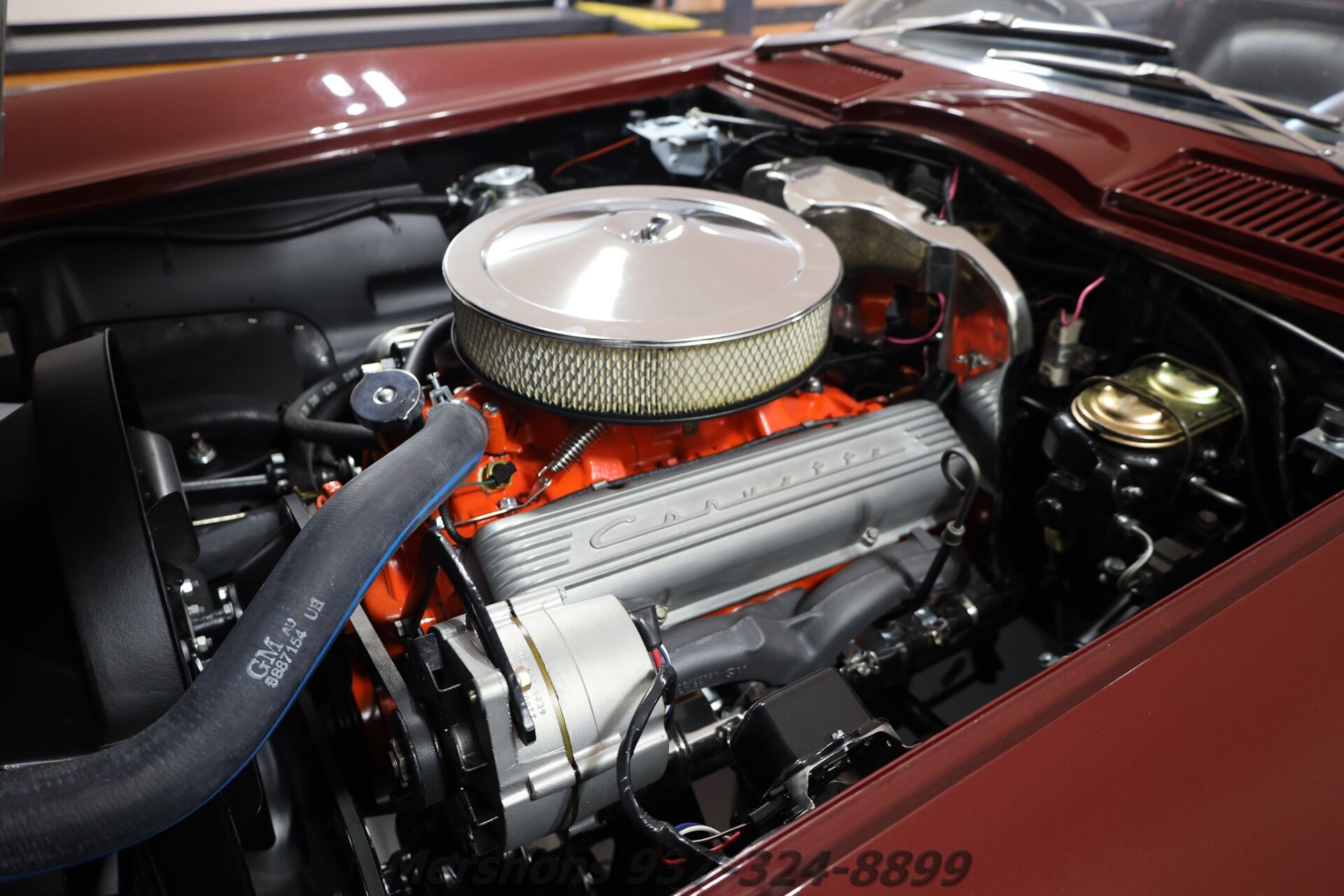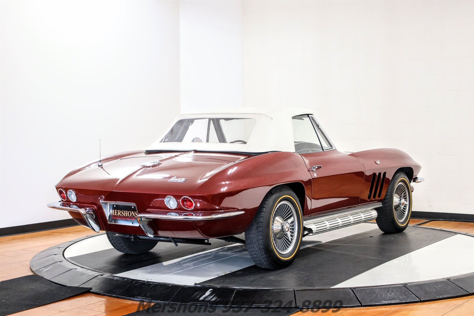 Color Code 988 Milano Maroon over a Black Interior with a White Convertible Top. Casting Number '3858174' HE Suffix Block. Numbers Matching 327 300 HP 4 Speed. Many Factory Correct type components including Power Steering, ignition shielding, air cleaner, Harrison radiator and expansion tank, Reverse Lockout shifter and more. This is one of the NICEST Mid-Year Corvettes on the market! A true Nut and Bolt restoration! Immaculate underbody with super clean floors! Great Cosmetics, and Beautiful Stainless and Chrome! The 327 is DIALED IN! And sounds Great breathing through its side exhaust!! There is a lot to like about this Milano Maroon Roadster! And Corvettes this clean do not last long! So please give us a call today!!