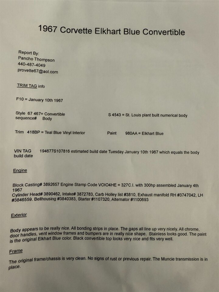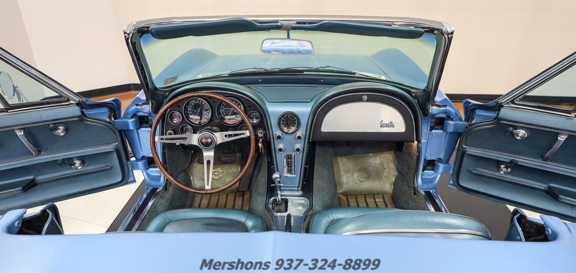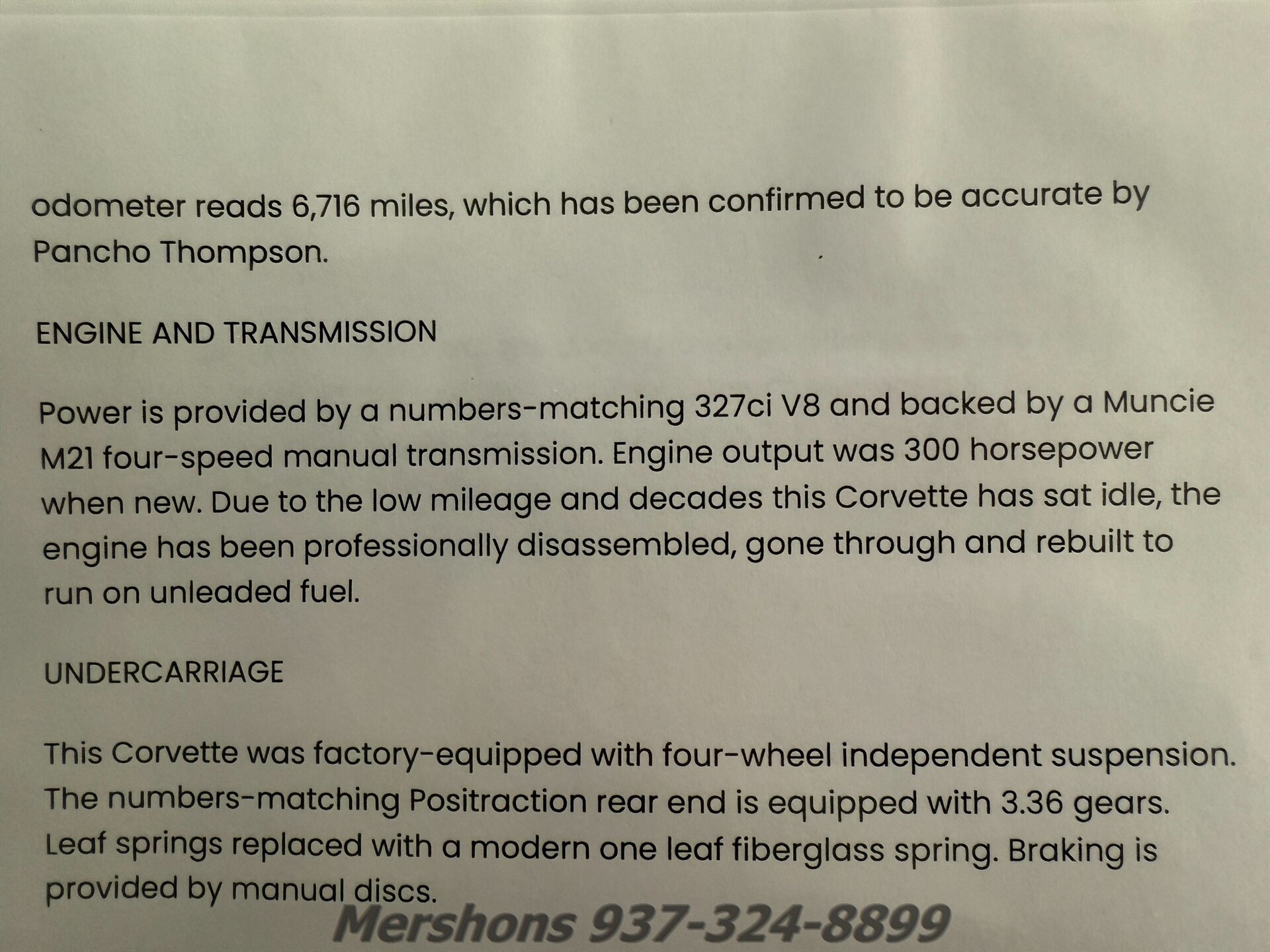 Color Code 980 Elkhart Blue Over Trim Code 418 Teal Blue with a Black Convertible top. Casting Number '3892657' HE Suffix Block. Numbers Matching 327 300 HP paired to a 4 Speed Manual Transmission. Many Factory Type Components including Power Steering, Reverse Lockout Shifter, ignition shielding, air cleaner, gas door assembly, door panels, bowtie mirror, Dash pads, Bolt On Wheels with Redline Tires and much more! Rare and Highly Desirable One year only Elkhart Blue! Paired with Teal Blue creating a Fantastic Color Combination! Very Nice Frame off Restoration! Clean and Dry Underbody! Rare Color Combinations make for excellent investments! So please give us a call today for more detailed information!