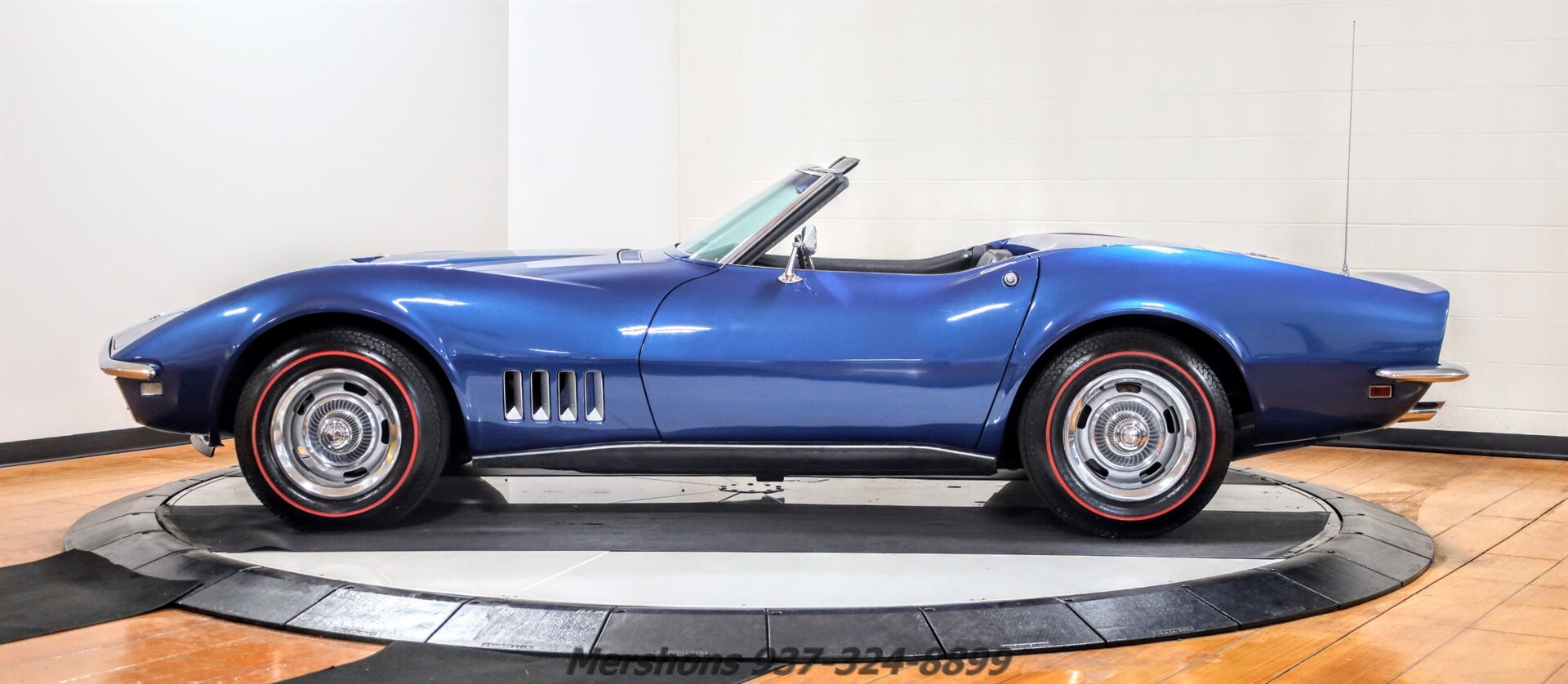 Color Code 978 International Blue over Black Interior with a Black Convertible Top. Casting Number '3935439' IL Suffix Block. Numbers Matching 427 390 HP Paired to a 4 Speed Manual Transmission. Many Original type Components including Ignition Shielding, Air Cleaner, Braided Stainless Ignition Wires, Reverse Lockout Shifter, Original Dash and Door Panels and more! Features include Factory Air Conditioning, Power Steering, Rally Wheels with Redline Radials and more! When is the last time you saw an International Blue '68 Corvette?? This is a RARE FIND! An International Blue 427 390 HP Big Block with a 4 Speed and Factory Air! That is a Mouthful right there! Stay cool while you bang gears in this Corvette! Just a hard car to come by, and Chrome Bumper Corvettes are Appreciating everyday! So now is the time to buy! Please give us a call today for more detailed information! We would love to hear from you!