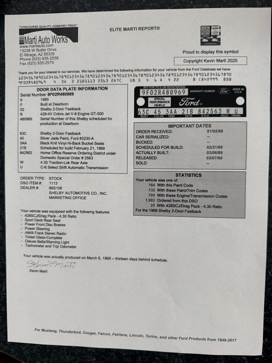 Color Code 45 Silver Jade with White Stripes over Trim Code 3AA Black Knit Vinyl with Hi-Back Bucket Seats!! Correct Date Code Ram Air 428 Cobra Jet paired with a C6 Automatic Transmission. Features include Ram Air, Drag Pack with 4.30 Gears, Power Steering, Power Front Disc Brakes, Tachometer, AM/8 Track Radio, Tinted Glass, Deluxe Belts, 5 Spoke Wheels wrapped in White Letter Tires and more! What a RARE FIND! A Real Deal 1969 Shelby GT500!! Offered with a Deluxe Marti Report! Built March 6th 1969 with a January 1969 Date Coded Block!! RARE RARE RARE 1 of 25 Produced with the DRAG PACK!! That includes a Locking Differential with 4.30 gears!! Only 164 Silver Jade Mustangs were produced in 1969 and VERY FEW were Shelby GT500s! This car makes ALL the right noises, and it is loads of fun out on the road! Ready to cruise, or be tucked away in your collection! An example this nice could go either way!! So please give us a call today for more detailed information on this Shelby GT500!!