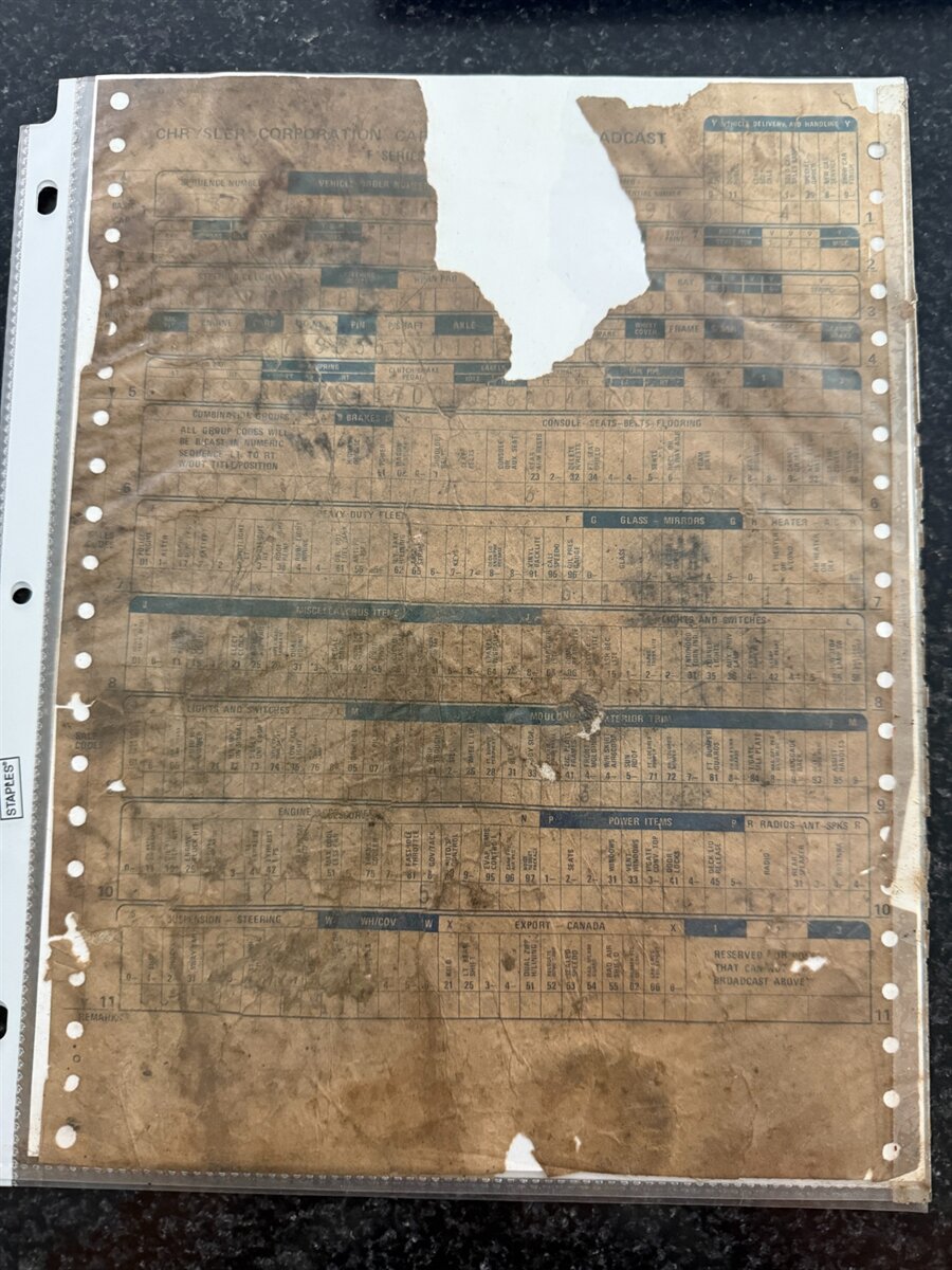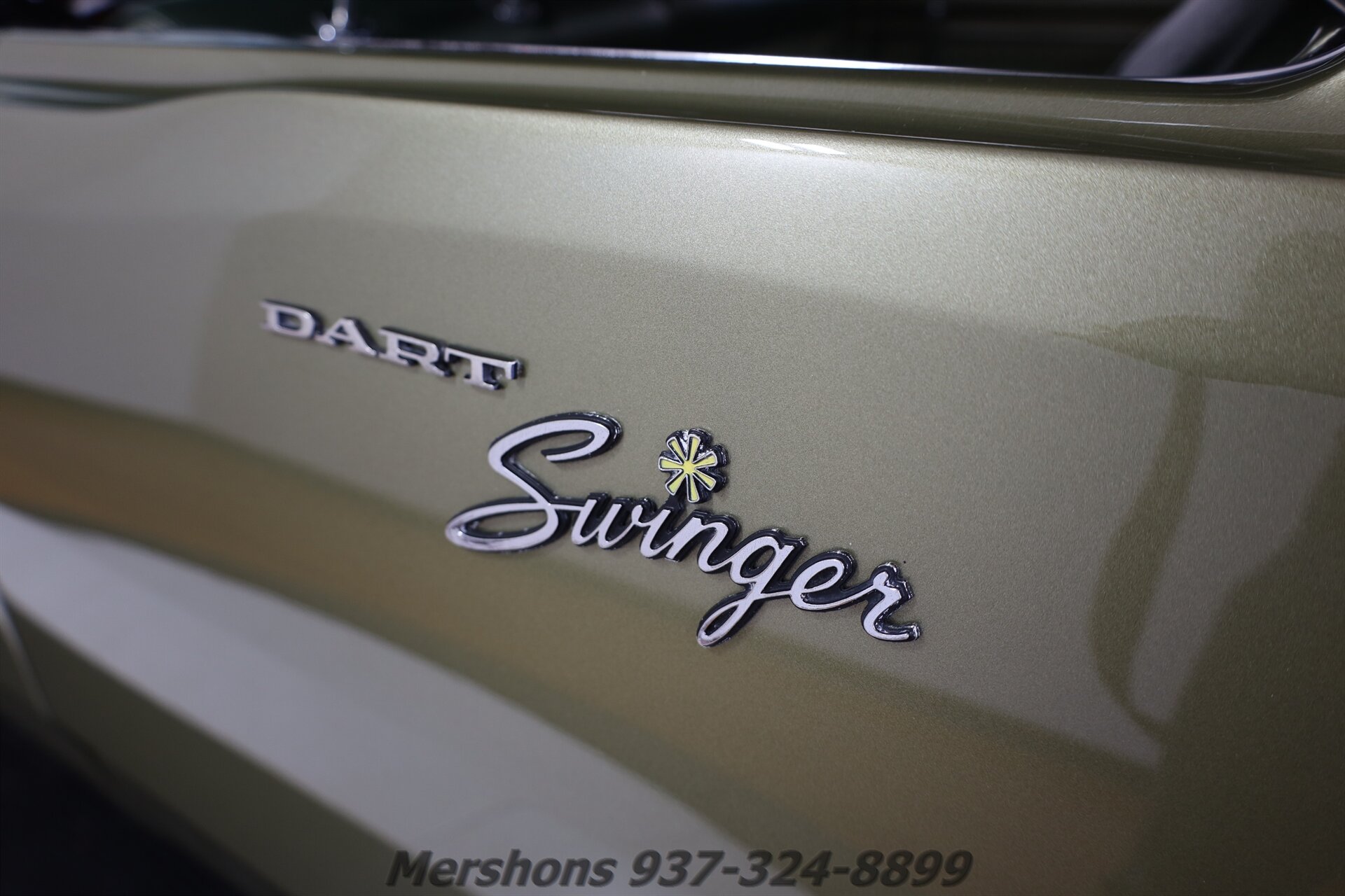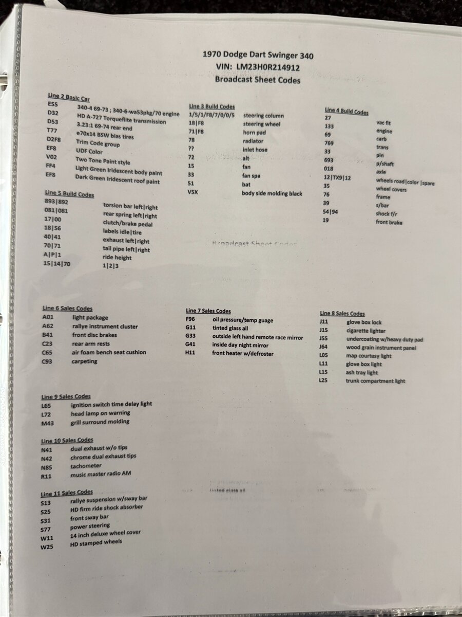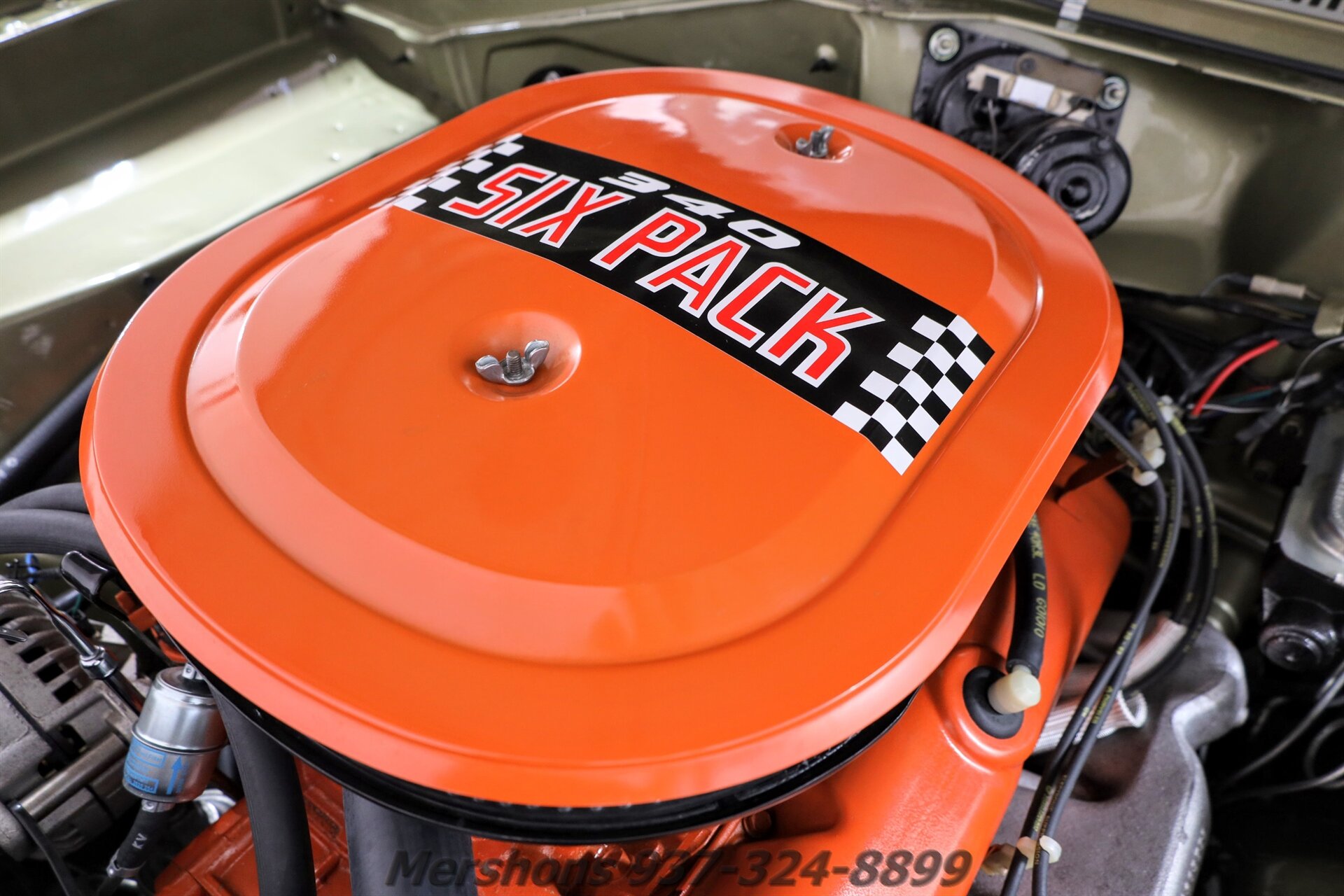 Color Code V02 Two Tone Paint consisting of, FF4 Light Green Iridescent Body with EF8 Dark Green Iridescent Roof Paint over Green Interior. Born Code E55 340 V8, Now a 340 Cubic Inch V8 with 6 Pack Originally Transmission Code D32 now 4 Speed Manual. Features Include 6 Pack Triple Dueces, Bumblebee Stripe, Dual Hood Scops, Power Steering, Rally Gauges with Tachometer, 8 3/4 Sure Grip Rear End, Tinted Glass, AM Radio, Rally Wheels wrapped in White Letter Radials and more! This is a Gorgeous Dart! Over the top Cosmetics, like new Stainless and Chrome! Clean and Dry Underbody, this car is the total package! Like actual Jewelry this is a car you will be proud to drive -anywhere-!! Immaculate Interior, spotless trunk with Spare, Jack and Tools! Loads and LOADS of documentation in a large binder included with the sale! Including the Broadcast sheets that were found in the car during its METICULOUS restoration! So please give us a call today, if you are in the market for a Dart, you wont find a nicer one! We look forward to chatting with you!
