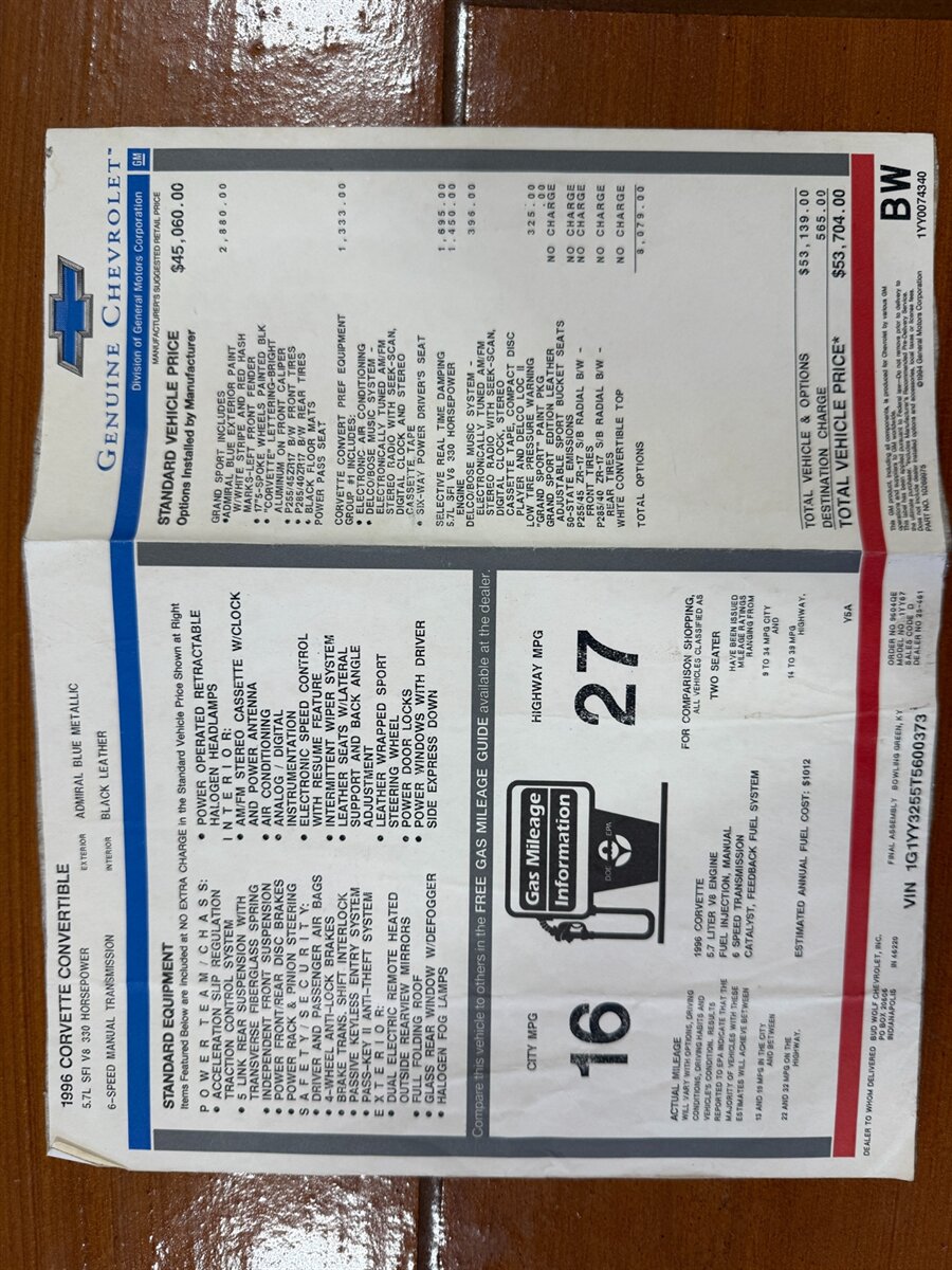Admiral Blue with a White Stripe and Red Grand Sport Fender Stripes over a Black Interior with a White Convertible Top. 5.7L LT4 330 HP V8 6 Speed. Features Include Factory Air Conditioning, Digital Climate Control, Cruise Control, AM/FM Radio with CD Player, Power Seats, Power Mirrors, Power Windows, Power Locks, Power Steering, Power Brakes, Gloss Black 5 Spoke Grand Sport Wheels wrapped in Performance Radials and much more! This is a RARE Corvette! Only 1,000 Grand Sports were produced in 1996! Powered by the Legendary LT4 V8 these cars are LOADS of Fun out on the road! And only 19,000 actual miles! These cars are Incredibly good investments, with a strong following, and with low production numbers they will continue to appreciate in the years to come! Low mileage, clean examples like this are the ones to buy! So please give us a call today for more information on this Grand Sport!