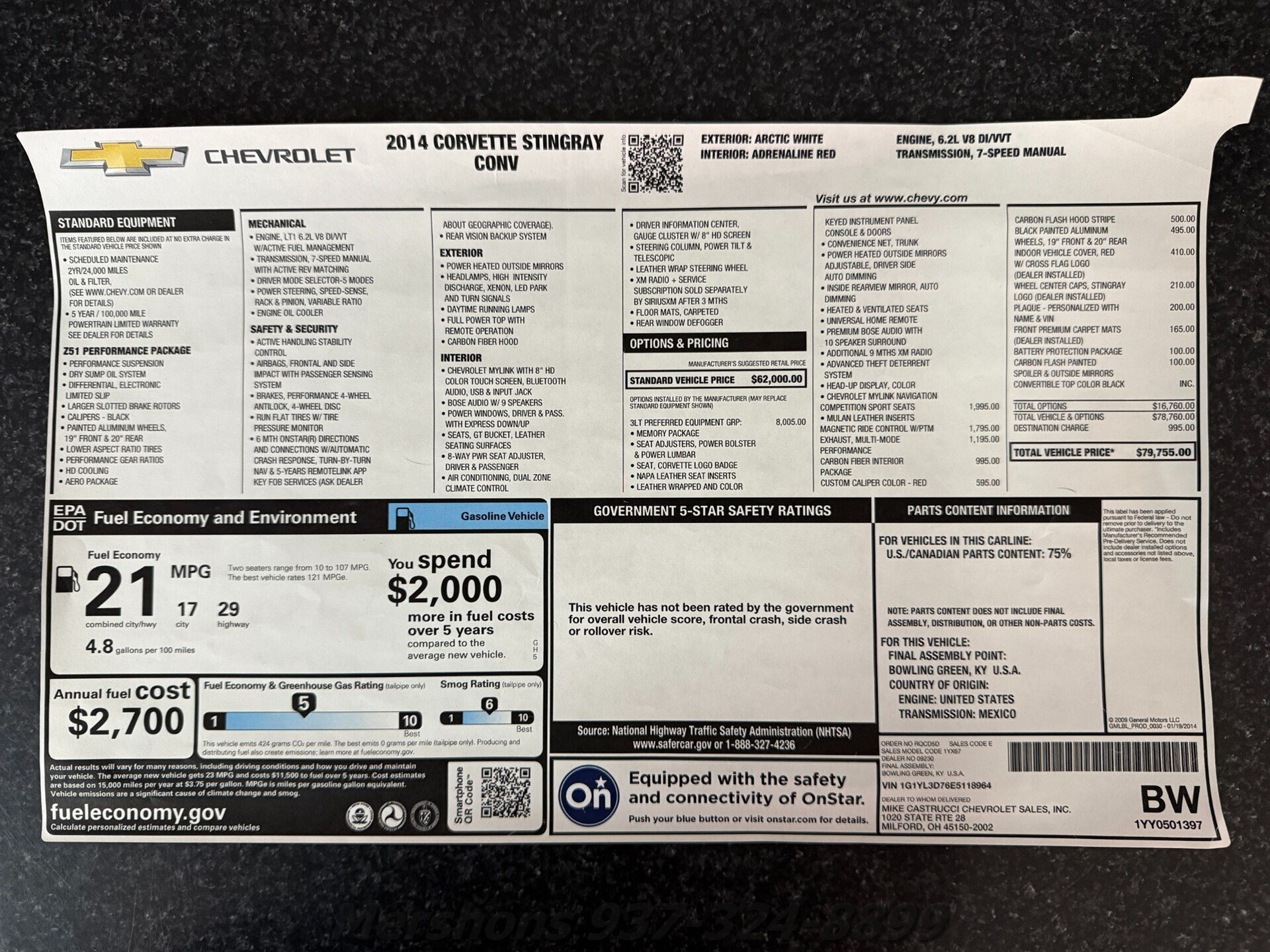 Arctic White over an Adrenaline Red Interior. LT1 6.2L V8 455hp 460ft/lbs. 7 Speed Manual Transmission. Features include Factory Air Conditioning and Dual Zone Climate Control, AM/FM/Satellite/Bluetooth Touchscreen radio, Back up Camera, ABS, Traction control, Keyless entry, Remote Start, Driving Mode Select, Gloss Black Wheels wrapped in Performance Radials and much more! This is a Highly Desirable Corvette! Special Ordered 3LZ Z51 with EVERY OPTION! RARE 7 Speed Manual!! Arctic White on Red is Always a Popular Combination! Like New Condition, with only 485 Miles on the Clock! If you are looking for a Gorgeous C7 this is the one! You will NOT Find a nicer, more Rare, Lower Mileage C7 on the Market today!! So please give us a call today, we would love to hear from you!