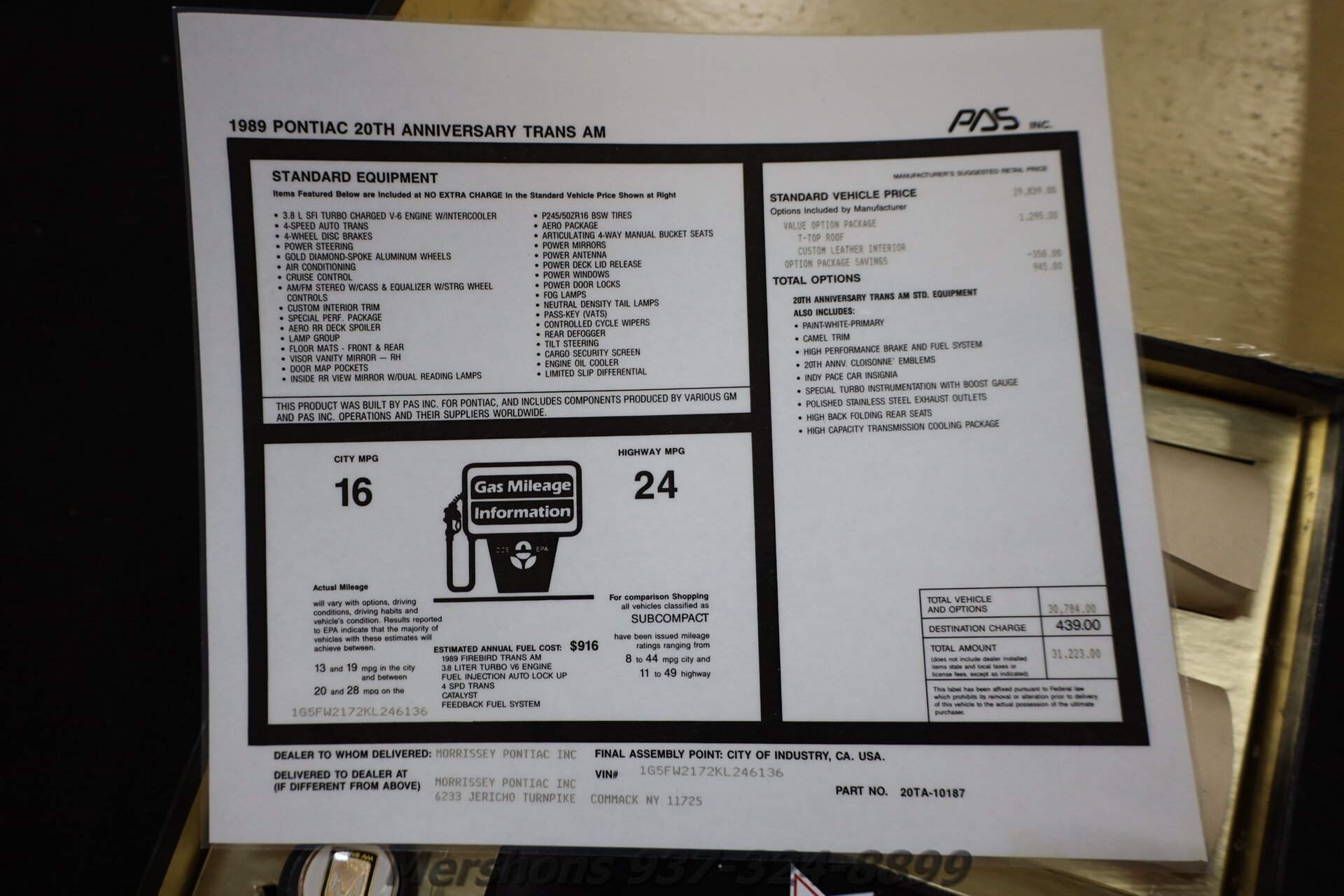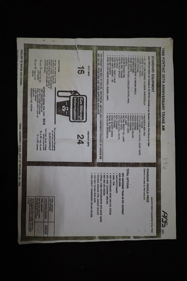 20th Anniversary Bright White over Saddle Tan Leather with T-Tops. 3.8L Turbocharged and Intercooled V6 Rated at 250 HP and 340 Ft/lbs paired to an Automatic Transmission. Features Include Indy Pace Car Package, WS6 Handling Package, GTA Aero Package, Factory Air Conditioning, T-tops, Cruise Control, Steering Wheel Mounted Radio Controls, Tilt Column, Power Windows, Power Locks, Power Mirrors, Power Steering, Power Four Wheel Disc Brakes, Delco Radio with Built in Equalizer, 20th Anniversary Jacket and Hat, Original and Complete 'Pizza Box' Owners kit, Limited Slip Differential, Gold Diamond Spoke Wheels with Performance Radials and MORE! What an absolutely INCREDIBLE FIND! Do you want a REAL Time Capsule, well here it is! This is the total package! Buying this car from us, will come with all the same paperwork and goodies you would have gotten in 1989 at the Pontiac Dealer when it was BRAND NEW! It has its original WINDOW STICKER! The Complete and Immaculate 'Pizza Box' Owners kit which holds the original, NEVER APPLIED Pace Car decals! These were to be installed by the owner of the car, after purchase, and very few originals survive in unused condition!! It also holds the original manuals, the original 20th Anniversary Keychain, and the 20th Anniversary CASSETTE! all in Gorgeous condition! Also included are the 20th Anniversary Hat and Owners Jacket both in Like New Condition!
