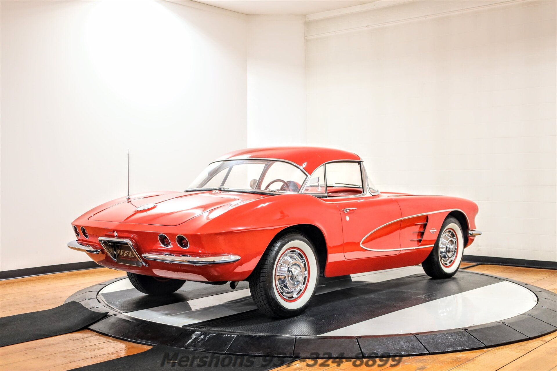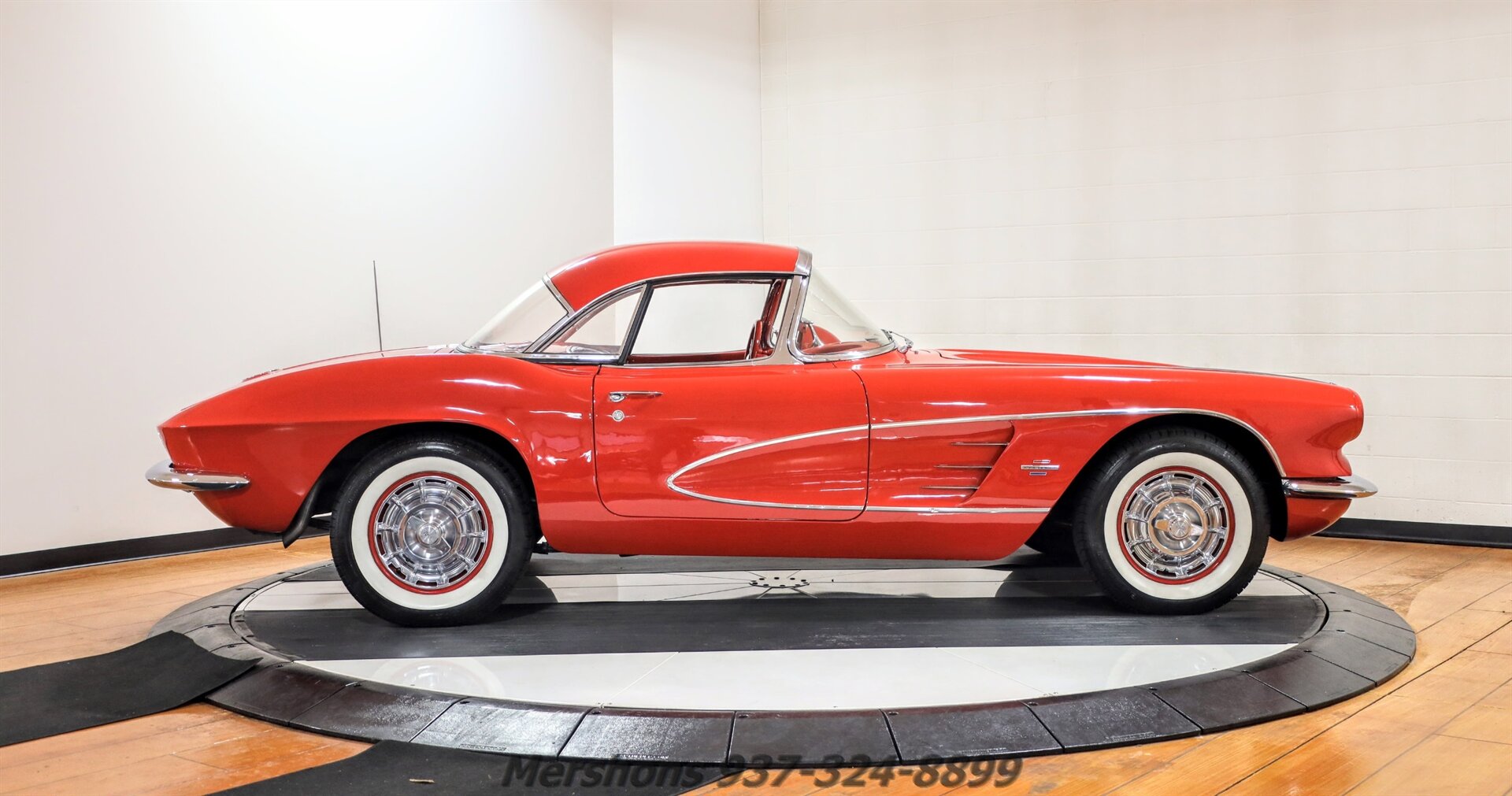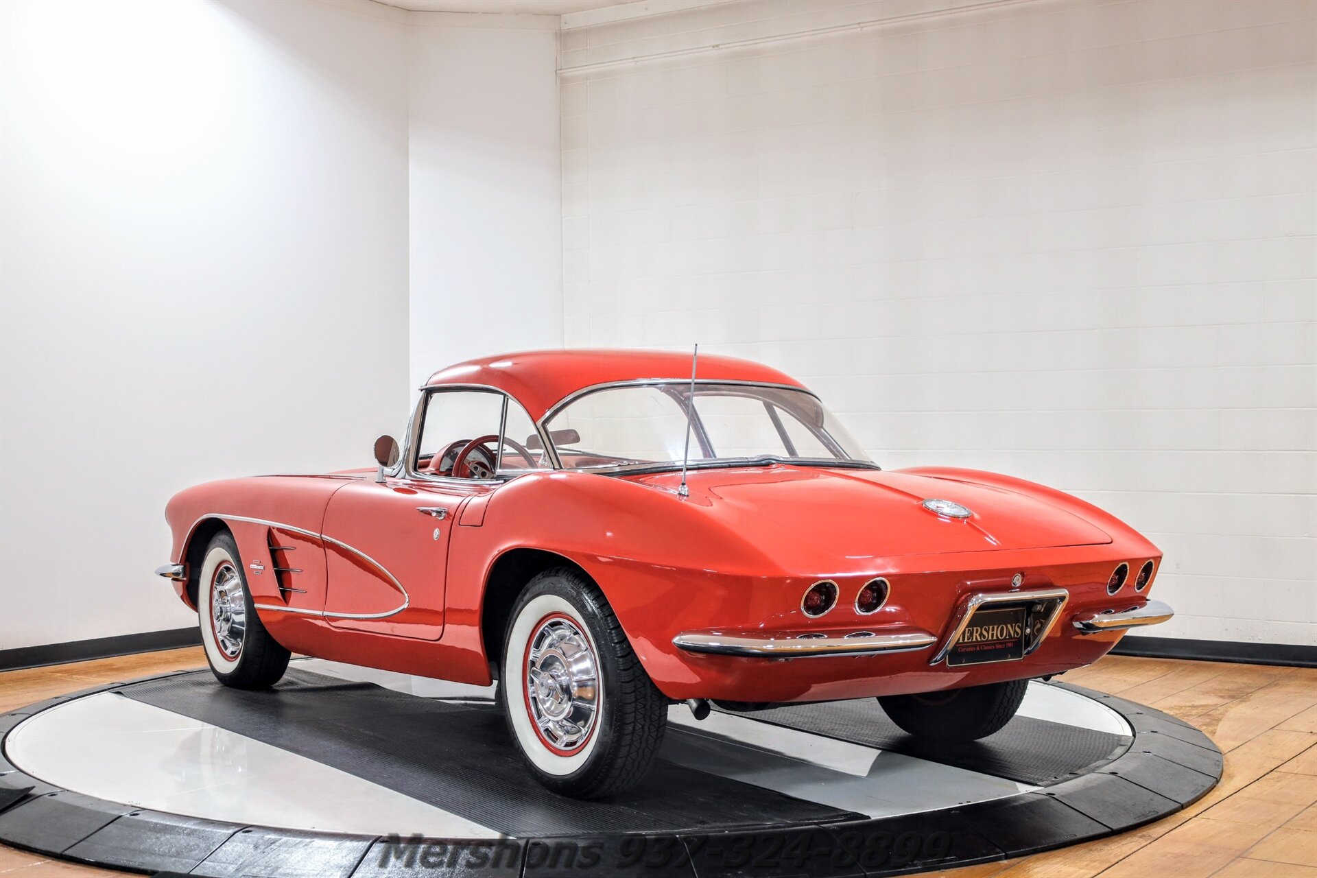 Roman Red over a Red Interior with a Brand New White Convertible top. Casting Number '3756519' CT Suffix Block. Numbers Matching 283 245 HP Dual Quads 4 Speed. Many Factory Type Components including Wonderbar Radio, Courtesy Light, Windshield Washer Bottle, Reverse Lockout Shifter, Seat Belts, Sun Visors, Ignition Shielding, Trunk Mat, Stainless Wheel Covers Whitewall Radials and more!. Very Iconic Roman Red '61! Beautiful Brightwork throughout, and Super Clear Instruments. Auxiliary Hardtop! New Carpets, Immaculate Door Panels, and a very Nice Dash! This Corvette attract attention everywhere it goes! And Red on Red is one of the best color combos on an early Corvette like this one! Very enjoyable to drive, and will have you looking for excuses to hit the road! So please give us a call today, we would love to hear from you!