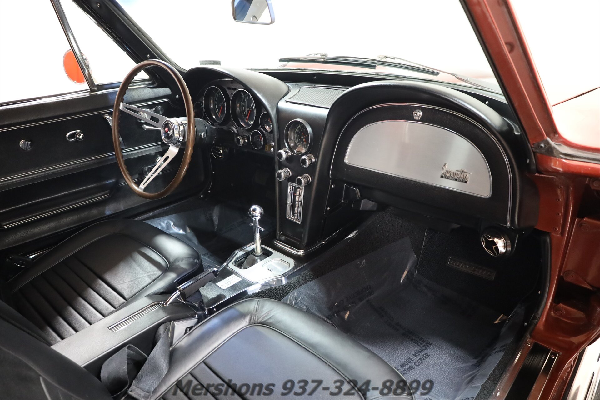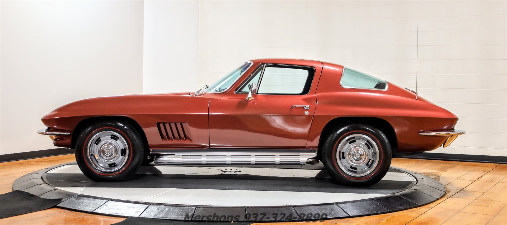 Color Code 988 Marlboro Maroon over Black Interior. Casting Number '3892657' HE Suffix Matching Numbers 327 300 HP -Dressed as a 350 HP- Paired to a 4 Speed Manual Transmission. Many Factory Type Components including Side Exhaust, Telescoping Steering Column, Power Steering, Power Brakes, AM/FM Radio, ignition shielding, air cleaner, gas door assembly, door panels, bowtie mirror, Dash pads, Rally Wheels with Redline Tires and much more! This is a Beautiful Frame Off Restored 1967 Coupe! With Modern 'Vintage Air' Air Conditioning! Marlboro Maroon POPS out in the sun, and it will stand out! Everyone has a Rally Red Corvette, be a little different! And Coupes are Soaring in value, and they are very difficult to get ahold of! They do not last long, so do not wait! Give us a call today!