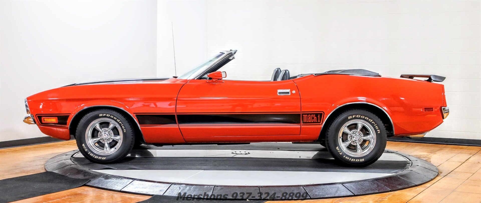 Bright Red with Black Mach 1 Stripes with a Black Interior and a Black Power Convertible top. Casting Number 'D02E-6015-AB'. 302 Small Block paired to a 3 Speed Manual Transmission. Features Include Power Steering, HEI Ignition, Power Convertible, Five Spoke Polished Aluminum Wheels wrapped in BFGoodrich T/A Radials and more! Beautiful Bright Red Paint! Nice Stainless and Chrome! Fun to drive out on the road! Great working Power Convertible top! Who doesnt love a Manual Shift Mustang?? Loads of fun to be had in this one! And a great entry level Collector car! So please give us a call today for more information! We would love to hear from you!