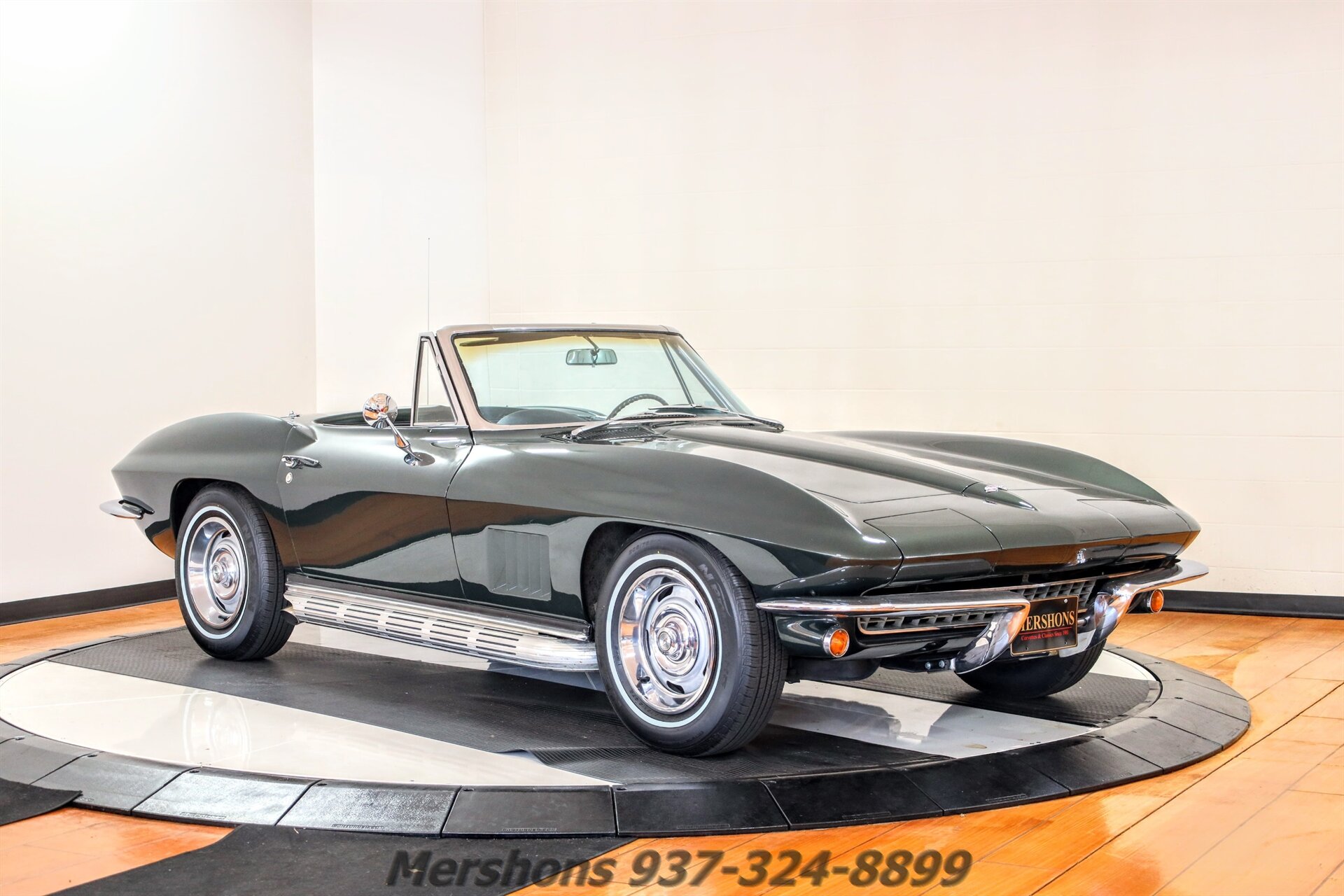 Color Code 983 Goodwood Green over a Black Interior with a Black Convertible top. Casting Number ‘3914678’ 327 300 HP Paired to a 4 Speed Manual Transmission. Many Factory Type Components including Side Exhaust, ignition shielding, air cleaner, gas door assembly, door panels, bowtie mirror, Dash pads, Rally Wheels with Whitewall Radials and much more! Goodwood Green was the most popular Color in 1967! And it looks Fantastic on these cars! Highly desirable, and attracts loads of attention! Everyone has a red Corvette! So Stand out in this beautiful Shade of Green! Sounds Excellent breathing through its side exhaust as well! So please give us a call today for more detailed information!